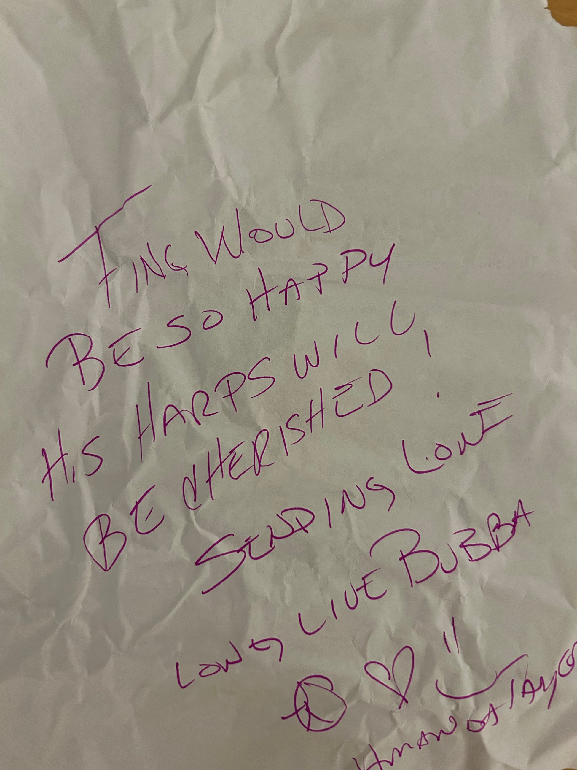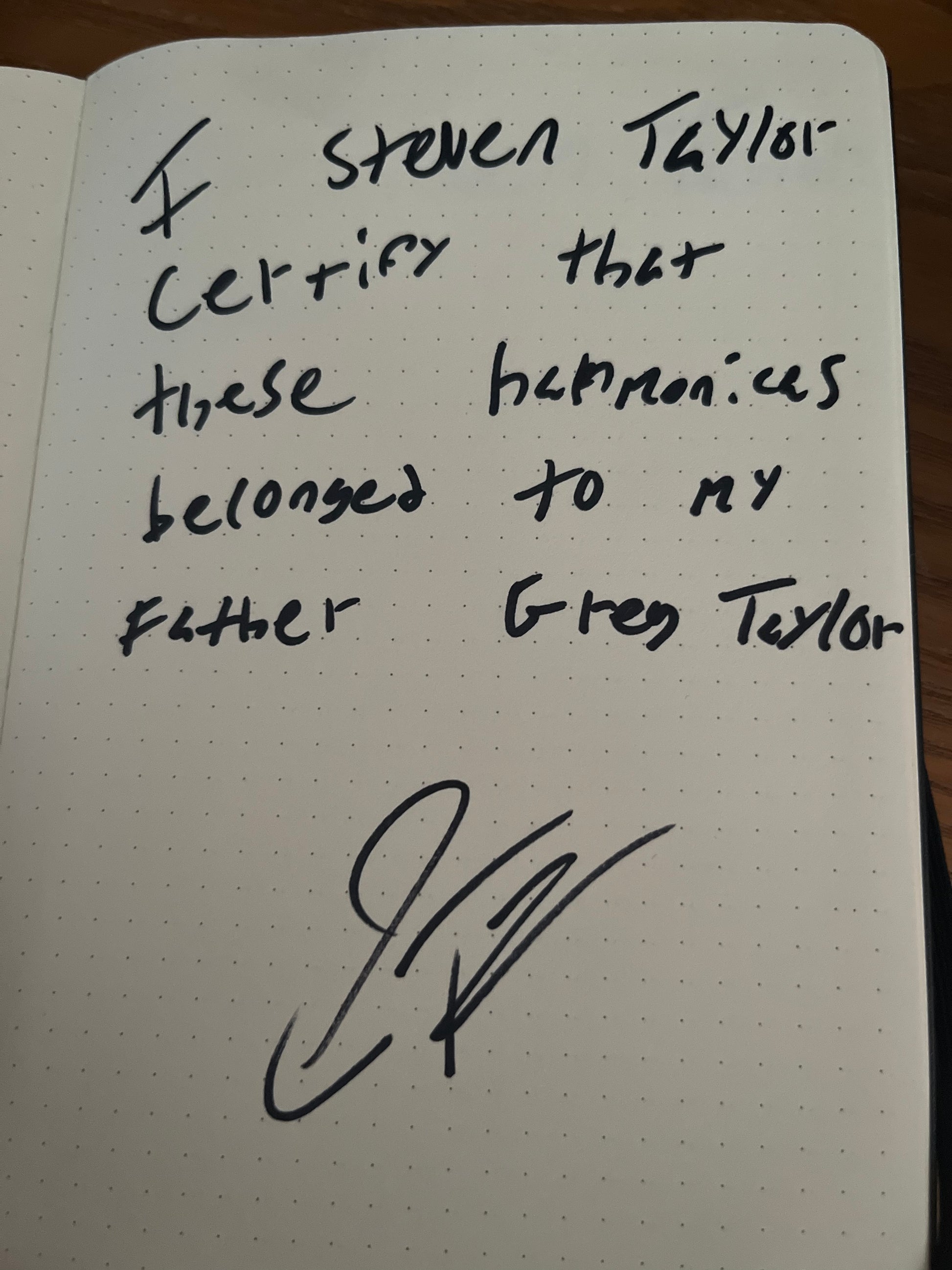 Hand written note by Greg's son, Steven Taylor, to authenticate.